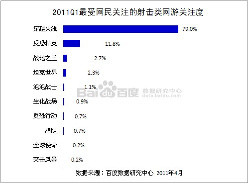 随着腾讯穿越火线的大获成功,更多的网游运营商加大了对射击类游戏的投入,因此2011年也会有更多的射击类产品进入市场。2011Q1射击类网游的关注排行中依然是穿越火线垄断市场,反恐精英占据11.8%的关注度,其它一些新游戏很多还处于内测阶段,关注度相对较小,但后续的市场表现也非常值得期待。