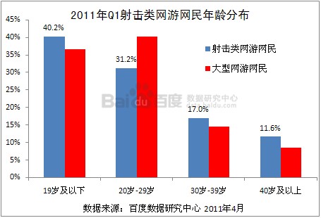 和大型网游玩家相比,射击类网游玩家中90后比例更高,达到40.2%,同时30岁以上群体的比例也更高;但20-29岁的玩家比例低于整体大型网游玩家的对应比例。