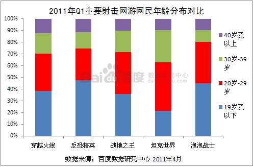 通过对比市场上主要的几款射击类网游的玩家,可以发现反恐精英和泡泡战士的玩家更加低龄化,其中特别是19岁以下群体的比例明显高于其它几款游戏。
