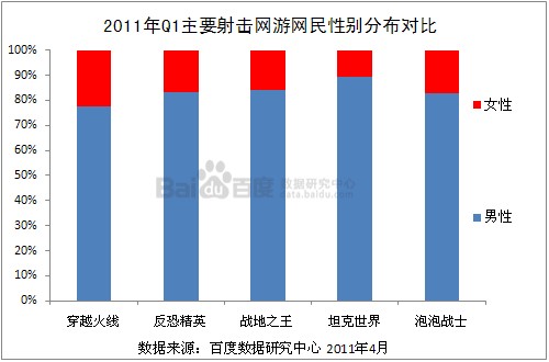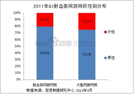 虽然整体大型网游玩家的性别比例已经是非常显著的男性化,但相比之下,射击类网游玩家男性比例更高,接近80%。